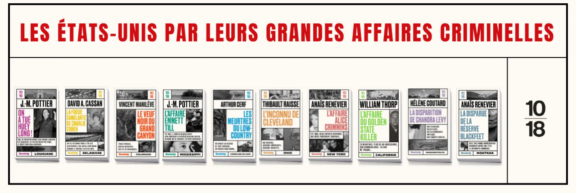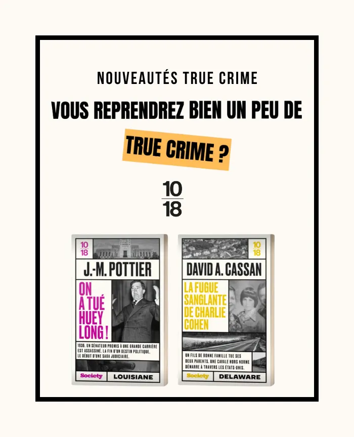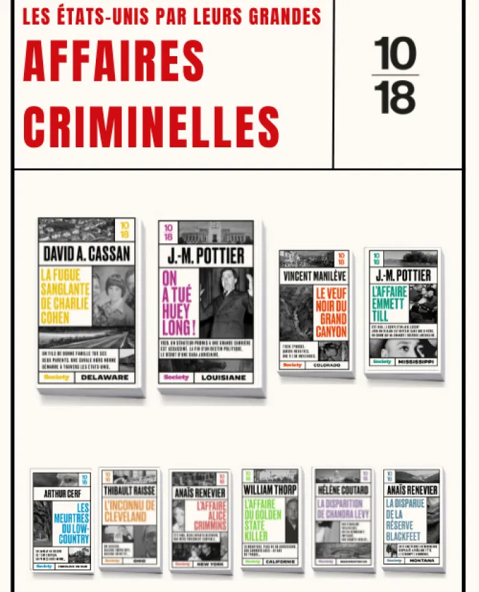 Le « True Crime » ayant décidément le vent en poupe avec un intérêt vif du public pour les enquêtes criminelles poussées, 10/18 et le magazine Society ont lancé en 2023 une collection qui sillonne les États-Unis au fil d’affaires palpitantes.