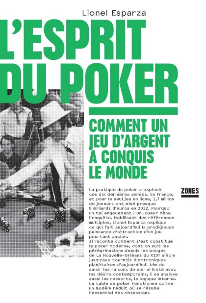 La pratique du poker a explosé ces dix dernières années. En France, et pour le seul jeu en ligne, 1,7 million de joueurs ont misé presque 8 milliards d'euros en 2012. Pourquoi un tel engouement ? Un joueur mène l'enquête. Mobilisant des références multiples, Lionel Esparza explique ce qui fait aujourd'hui la prodigieuse puissance d'attraction d'un jeu pourtant ancien.