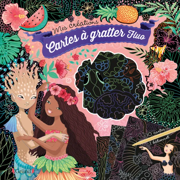 Dans ta pochette, tu trouveras 10 cartes à gratter et un bâtonnet pour réaliser de magnifiques tableaux de sirènes, animaux marins et vahinés. Il te suffit de gratter l'encre noire des cartes en suivant le modèle pour faire apparaître de magnifiques couleurs fluorescentes. Une nouvelle manière de colorier tout en créativité !